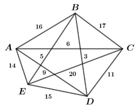 Trong kì nghỉ hè bạn Phong muốn đi du lịch qua các địa điểm du lịch $A,B,C,D,E$ như hình vẽ. Khoảng cách giữa các địa điểm du lịch như sau $AB = 16,BC = 17,CD = 11,DE = 15,EA = 14$, $AC = 6,CE = 20,EB = 5,BD = 3,DA = 9$ (đơn vị là $km$). Biết rằng số tiền bạn Phong phải trả cho 1 km là 15000 đồng. Giả sử rằng bạn Phong xuất phát từ điểm $A$ đi qua các điểm $B,C,D,E$ đúng một lần sau đó trở về điểm $A$. Số tiền bạn Phong phải trả thấp nhất là bao nhiêu (kết quả làm tròn đến hàng nghìn)?