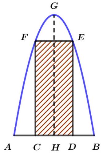 Một cổng của một tòa nhà có dạng parabol gồm hai phần: phần hai cánh cửa hình chữ nhật $CDEF$, còn lại là phần xiên hoa trang trí (hình bên). Biết rằng $GH = 16\text{m},AB = 8\text{m}$ và $AC = BD = 1,7\text{m}$. Diện tích phần cổng làm xiên hoa trang trí bằng bao nhiêu mét vuông (kết quả làm tròn đến hàng phần mười)?