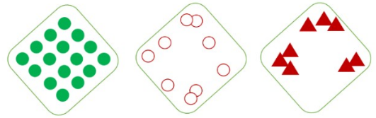 Hình dưới mô tả ba kiểu phân bố cá thể của quần thể trong môi trường thuộc ba loài giả định trong diện tích như nhau là 10m2. Số lượng cá thể của kiểu phân bố thể hiện hiệu quả nhóm là bao nhiêu?