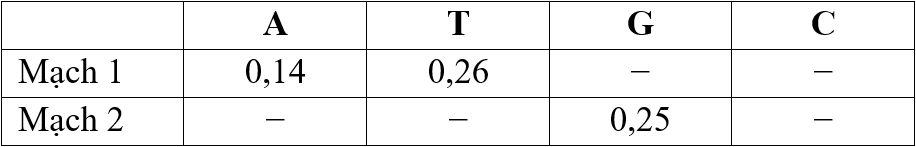 Một gene có tỷ lệ tương ứng các nucleotide ở các mạch đơn thể hiện ở bảng dưới đây. Biết tổng tỷ lệ các loại nucleotide ở mỗi mạch đơn là 1,00. Dấu − thể hiện chưa xác định được số liệu: