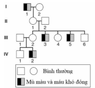 Phả hệ hình bên cho thấy bốn thế hệ của một gia đình được M.Madlener mô tả vào năm 1928. Biết rằng mỗi bệnh do một gene riêng biệt quy định, các allele gây bệnh đều nằm trên NST giới tính X không có allele trên Y, không phát sinh đột biến mới trong phả hệ. Phân tích phả hệ và cho biết phát biểu nào sau đây sai?