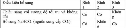 Một bạn học sinh tiến hành thí nghiệm đặt cây rong đuôi chó trong các bình thủy tinh kín đựng nước cất đun sôi để nguội, sao cho cây ngập hoàn toàn trong nước và bổ sung một số điều kiện thí nghiệm khác như mô tả dưới đây: