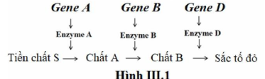 Ở một loài thực vật, tính trạng màu hoa do 3 cặp gene A, a; B, b; D, d phân li độc lập cùng quy định. Kiểu tương tác giữa 3 cặp gene được mô tả bằng sơ đồ Hình III.1.