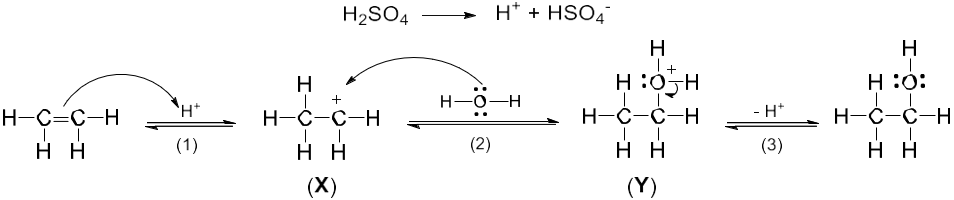 Phản ứng giữa ethylene với dung dịch H2SO4 loãng, đun nóng, diễn ra theo cơ chế như sau:
