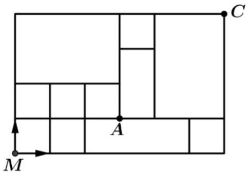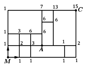 Trên đường đi từ nhà Mạnh tại vị trí điểm $M$ đến trường tại vị trí điểm $C$ có vị trí điểm $A$ người ta đang thi công sửa chữa đường nên không thể đi qua được. Biết rằng toàn bộ cung đường theo bản đồ từ dưới lên trên và từ trái qua phải là đường một chiều nên Mạnh chỉ được phép đi lên hoặc đi sang phải. Vậy Mạnh có bao nhiêu cách đi từ nhà đến trường?