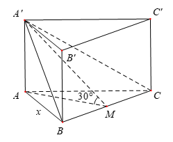 Cho hình lăng trụ tam giác đều \(ABC \cdot A'B'C'\). Biết số đo góc nhị diện \(\left[ {A',BC,A} \right]\) bằng \({30^ \circ }\) và tam giác \(A'BC\) có diện tích bằng 32. Khoảng cách giữa hai đường thẳng \(AB\) và \(A'C'\) bằng bao nhiêu?