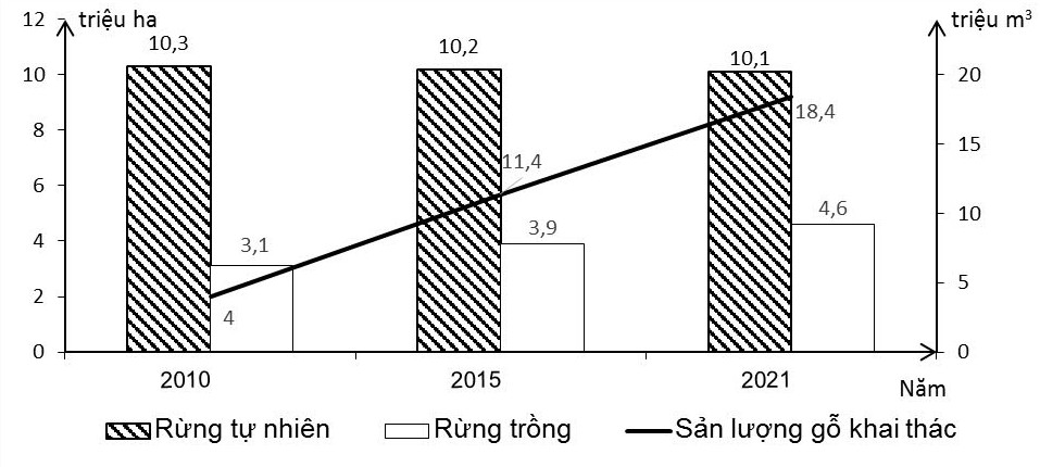 Cho biểu đồ sau: Biểu đồ diện tích rừng và sản lượng gỗ khai thác của nước ta giai