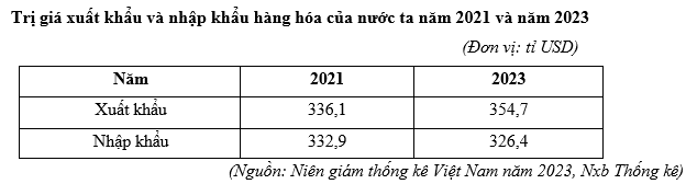 Căn cứ vào bảng số liệu trên, hãy cho biết giá trị xuất siêu của nước ta năm 2023 so với năm 2021 tăng bao nhiêu tỉ USD (làm tròn kết quả đến một chữ số thập phân).