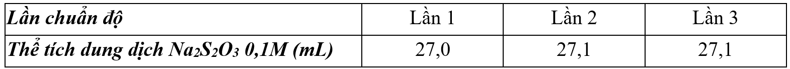 Hàm lượng glucose có trong một mẫu dược phẩm có thể được xác định bằng phương pháp chuẩn độ iodine như sau: Cân 2,103 gam mẫu hòa tan vào 100 mL nước, thêm tiếp 120 mL nước iodine 0,1M (dư) và 10 mL dung dịch NaOH 5% để tạo môi trường kiềm, lắc, trộn đều. Đậy nút bình và để vào chỗ tối trong khoảng 20 phút. Lấy bình ra, thêm từ từ 15 mL H2SO4 10%, lắc nhẹ. Sau đó, thêm vào dung dịch sau phản ứng vài giọt dung dịch hồ tinh bột, rồi vừa lắc vừa nhỏ từ từ dung dịch sodium thiosulfate (Na2S2O3) 0,1M vào dung dịch ở trên đến khi mất màu xanh thì dừng lại. Kết quả thể tích dung dịch sodium thiosulfate đã tiêu tốn sau 3 lần chuẩn độ được ghi lại ở bảng sau: