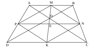 Cho hình thang $ABCD$ có $AB \parallel CD$. Gọi $O$ là giao điểm của hai đường chéo $AC$ và $BD$. Gọi $M,\,\, N,\,\, P$ lần lượt là trung điểm của $AB,\,\, BC,\, AD$. Gọi $E$ là trung điểm của $PN$. Chứng minh rằng $M,\,\, O,\,\, E$ thẳng hàng.