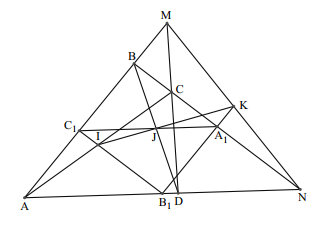 Chứng minh $\dfrac{IC_{1}}{IB_{1}}.\dfrac{KB_{1}}{KA_{1}}.\dfrac{JA_{1}}{JC_{1}} = 1$ để suy ra $I,\,\, J,\,\, K$ thẳng hàng