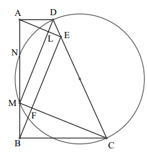 Cho hình thang vuông $ABCD$ có $\angle A = \angle B = 90{^\circ}$. Đường tròn đường kính $CD$ cắt $AB$ tại $M,\,\, N$ ($M$ nằm giữa $N,\,\, B$). Đường thẳng qua $A$ song song với $MC$ cắt đường thẳng qua $B$ song song với $MD$ tại $E$. Chứng minh $C,\,\, E,\,\, D$ thẳng hàng