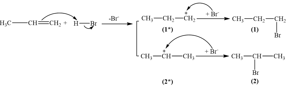 Phản ứng cộng hydrogen bromide vào propylene diễn ra theo cơ chế như sau:Các sản phẩm trung gian (1*)