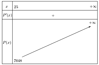 | b) Tổng chi phí để sản xuất 8000 sản phẩm $Y$ được tính theo $P(x) = 200x + \dfrac{800}{3x}$ (đơn vị nghìn đồng). | ||