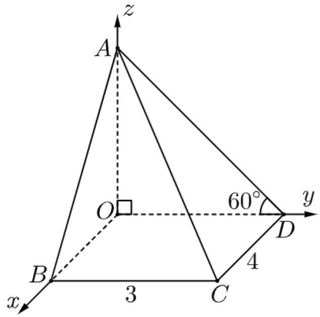 Cho khối tứ diện $ABCD$ có $BC = 3,CD = 4,\widehat{ABC} = \widehat{ADC} = \widehat{BCD} = 90^{\circ}$. Góc