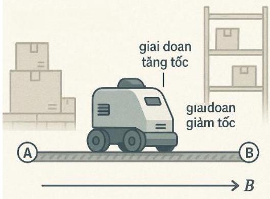 Một robot tự hành ở một cảng vận chuyển công nghệ cao bắt đầu di chuyển từ vị trí nghỉ tại điểm $A$. Robot di chuyển như sau: Trong giai đoạn đầu, robot tăng tốc đều từ vận tốc $0\left( {\text{m}/\text{s}} \right)$ đến $10\left( {\text{m}/\text{s}} \right)$ trong thời gian chưa biết $t_{1}$ giây theo hàm số vận tốc $v_{1}(t) = at$ ($a$ gọi là gia tốc trong giai đoạn này, $a\left( {\text{m}/\text{s}^{2}} \right)$). Sau đó, robot tiếp tục di chuyển với vận tốc không đổi trong 40 giây. Cuối cùng, robot giảm tốc đều từ $10\left( {\text{m}/\text{s}} \right)$ và dừng lại đúng tại băng chuyền điểm $B$ với thời gian $t_{2}$ giây theo hàm vận tốc $v_{2}(t) = 10 - bt$ (b gọi là gia tốc trong giai đoạn này, $b\left( {\text{m}/\text{s}^{2}} \right)$). Toàn bộ quá trình vận chuyển diễn ra trong tổng thời gian là 70 giây.