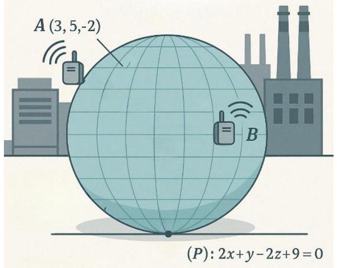 Một công ty xây dựng một hệ thống Giám sát môi trường tại khu công nghiệp. Hai cảm biến không dây được đặt tại hai vị trí $A,B$ trong không gian 3 chiều để thu thập dữ liệu không khí. Để đảm bảo tín hiệu truyền giữa hai cảm biến ổn định, công ty thiết kế một bóng bảo vệ tín hiệu hình cầu di động nhưng luôn đi qua cả hai cảm biến $A$ và $B$. Bóng này cần tiếp xúc với mặt đất để đảm bảo tính ổn định. Giả sử trong không gian với hệ toạ độ $Oxyz$, toạ độ các điểm là $A\left( {3;5; - 2} \right),B\left( {- 1;3;2} \right)$ và mặt đất được mô tả bằng mặt phẳng: $(P):2x + y - 2z + 9 = 0$. Trong quá trình mô phỏng, điểm tiếp xúc giữa bóng bảo vệ và mặt đất (gọi là $C$) thay đổi. Kỹ sư cần xác định khoảng cách từ gốc tọa độ $O\left( {0,0,0} \right)$ đến điểm tiếp xúc $C$ để đánh giá mức độ ảnh hưởng từ vị trí đặt thiết bị. Gọi $m_{1}$ là giá trị lớn nhất, và $m_{2}$ là giá trị nhỏ nhất của độ dài $OC$. Tính giá trị $m_{1}~^{2} + m_{2}~^{2}$.