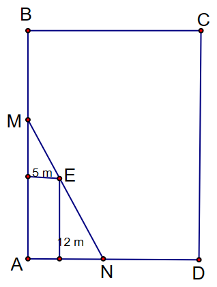 Biết rằng khoảng cách từ cọc $E$ đến bờ $AB,AD$ lần lượt là 5 m và 12 m . Hỏi diện tích nhỏ nhất của phần góc ao $AMN$ mà anh Hải có thể quây được là bao nhiêu?