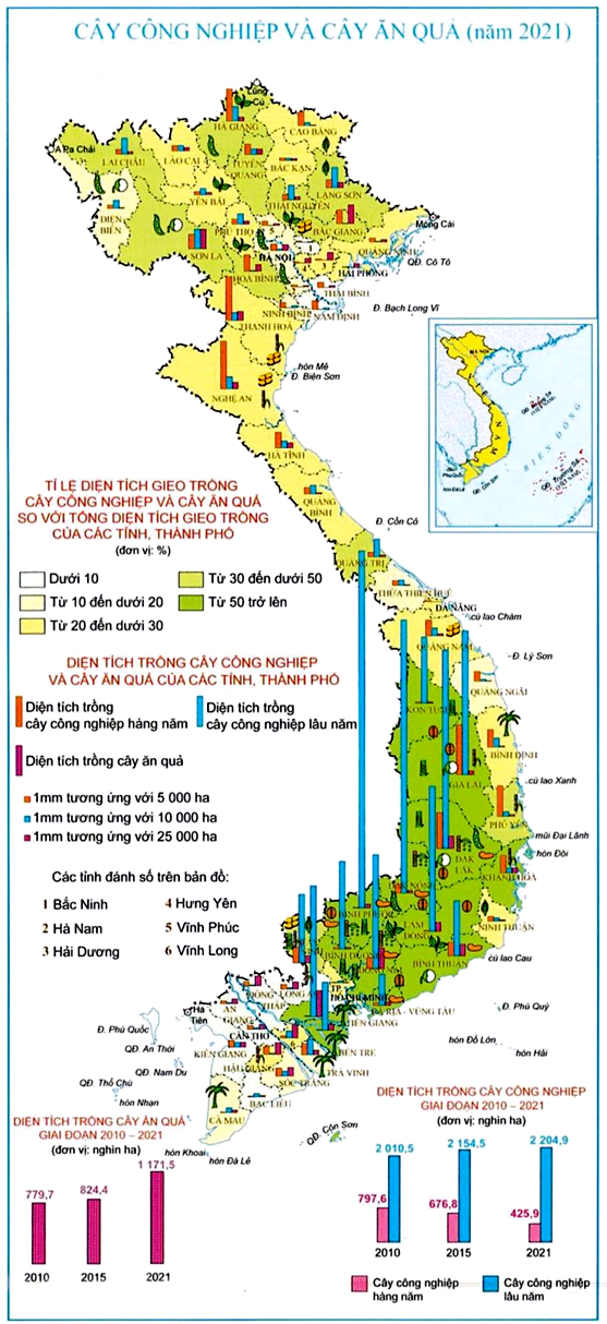 Dựa vào bản đồ, diện tích trồng cây công nghiệp lâu năm được thể hiện bằng cột màu xanh.