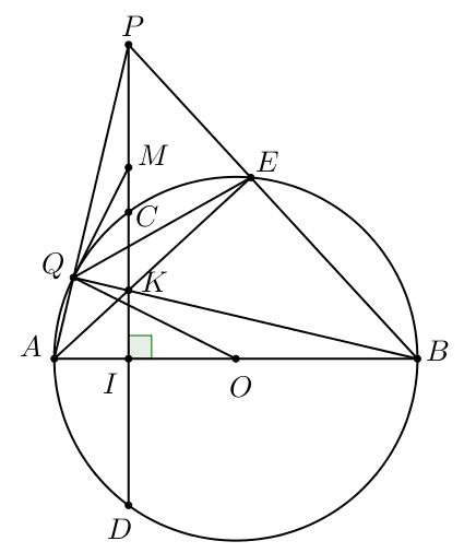 Gọi M là trung điểm của PK. Khi đó M là tâm đường tròn ngoại tiếp $\Delta PEQ$