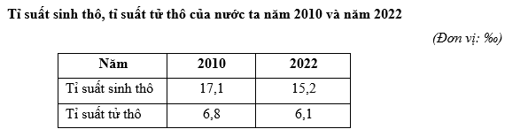 Căn cứ bảng số liệu trên, hãy cho biết tỉ lệ gia tăng dân số tự nhiên của nước ta năm 2022 so với năm 2010 giảm bao nhiêu phần trăm (làm tròn kết quả đến hai chữ số thập phân).