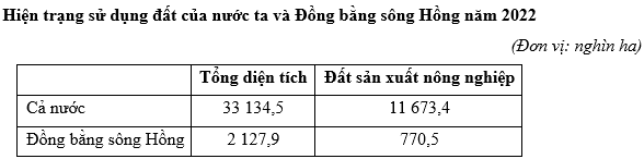 Căn cứ bảng số liệu trên, hãy cho biết năm 2022 tỉ trọng đất sản xuất nông nghiệp của cả nước trong tổng diện tích đất tự nhiên nhỏ hơn tỉ trọng đất sản xuất nông nghiệp của Đồng bằng sông Hồng trong tổng diện tích đất tự nhiên của vùng này bao nhiêu phần trăm (làm tròn kết quả đến hai chữ số thập phân).