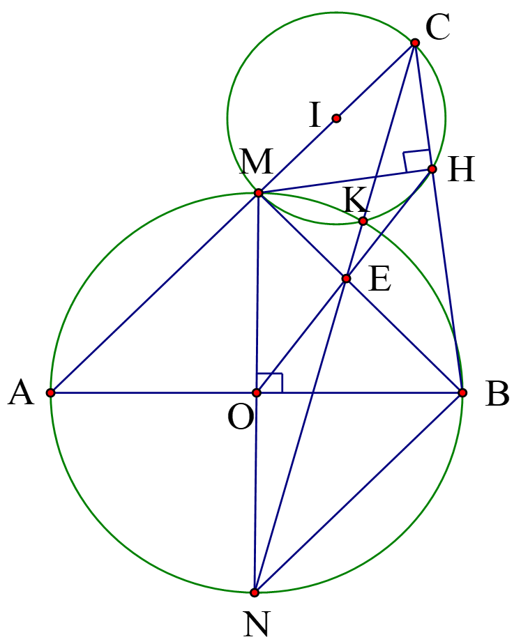 Cho đường tròn (O) có hai đường kính AB và MN vuông góc với nhau. Trên tia đối của tia MA lấy điểm C khác điểm M. Kẻ MH vuông góc với BC ($H \in BC$).
