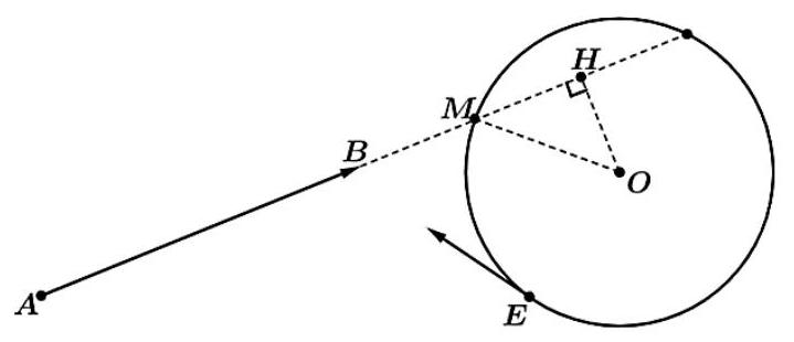 | d) Trong tình thế cấp bách ấy, các nhà khoa học đã quyết định phóng một tên lửa từ vị trí E thuộc mặt đất đi thẳng về phía thiên thạch để làm thay đổi quỹ đạo của nó, BE là tiếp tuyến của mặt cầu (Trái Đất). Tốc độ của tên lửa là 2,5 nghìn km/ngày dự kiến tên lửa sẽ va chạm với thiên thạch tại vị trí B; vì vậy họ phải phóng tên lửa vào ngày 11/1/2025. |