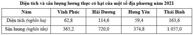 Theo bảng số liệu, để thể hiện diện tích và sản lượng lương thực có hạt của một số địa phương năm 2021, dạng biểu đồ nào sau đây là thích hợp nhất?