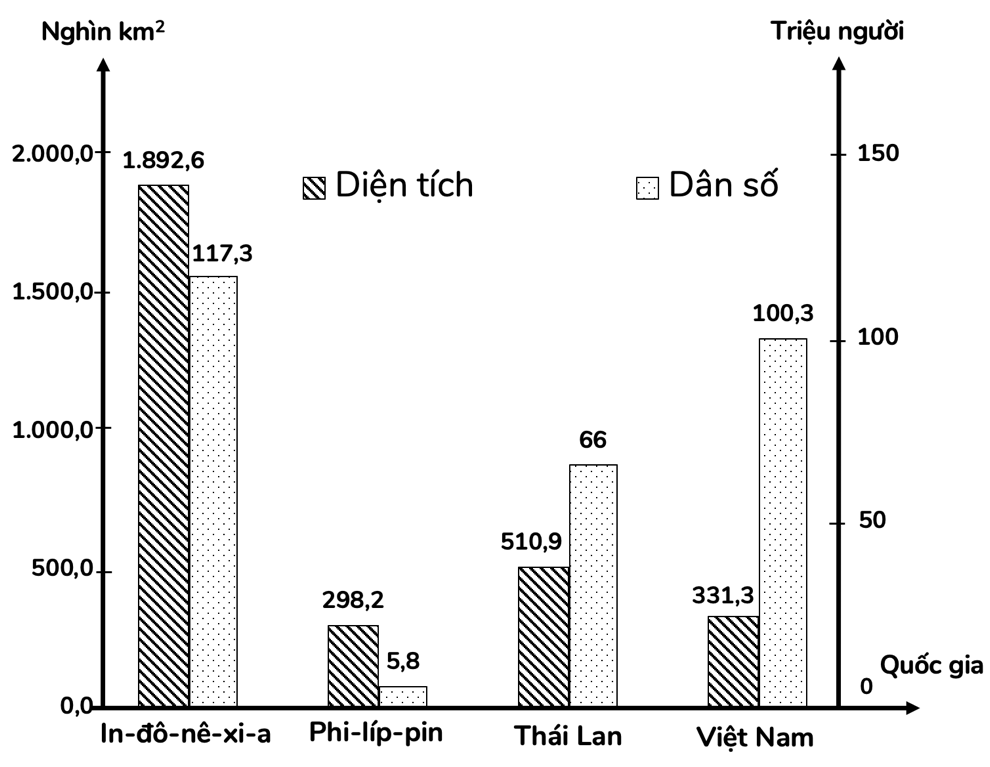 Cho biểu đồ: Diện tích và dân số của một số quốc gia năm