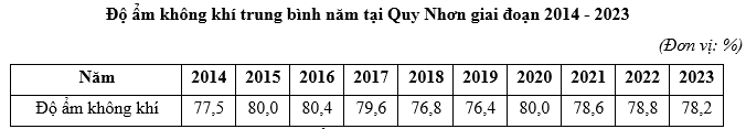 Căn cứ vào bảng số liệu trên, hãy cho biết độ ẩm không khí trung bình năm tại Quy Nhơn trong giai đoạn trên là bao nhiêu phần trăm (làm tròn kết quả đến một chữ số thập phân).