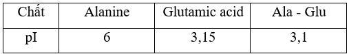 Hỗn hợp dipeptide Ala-Glu và hai amino acid thành phần (alanine và glutamic acid) được phân tách bằng điện di ở pH = 6. Biết tại pI (pH đẳng điện) của các chất được cho trong bảng như sau