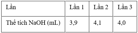 Kết quả chuẩn độ 10,0 mL dung dịch X khi sử dụng dung dịch chuẩn NaOH 0,01 M được ghi trong bảng sau: