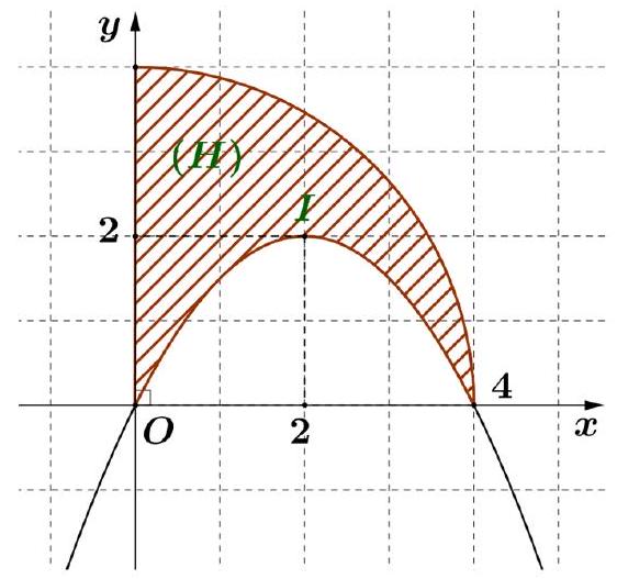 Cho hình phẳng $(H)$ giới hạn bởi $\dfrac{1}{4}$ cung tròn của đường tròn tâm $O\left( {0;0} \right)$ và bán kính bằng 4 , parabol $(P)$ có tọa độ đỉnh $I\left( {2;2} \right)$ và đi qua gốc tọa độ $O$, các đường thẳng $x = 0;x = 4$ như hình vẽ bên.