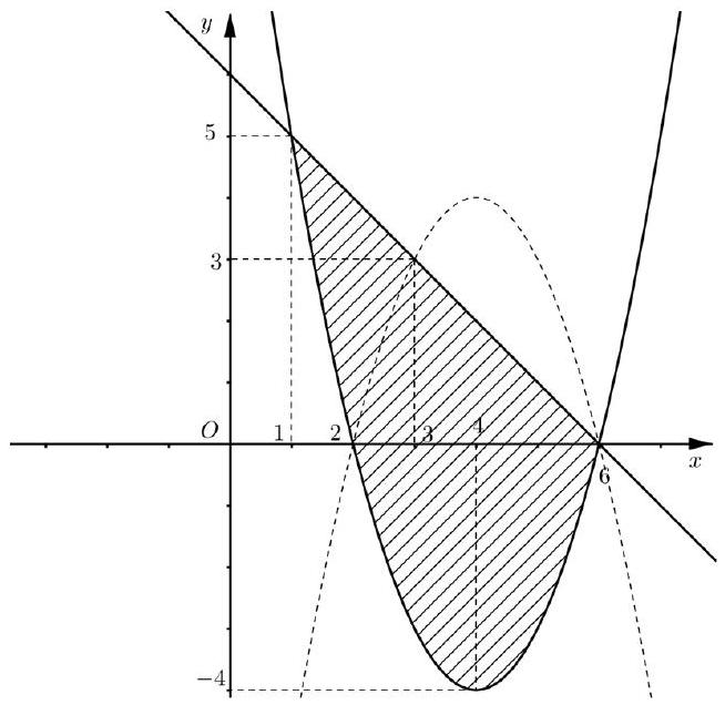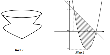 Một cái bình cổ có hình dạng như hình 1. Giả sử mô hình toán mô phỏng việc tạo thành cái bình cổ đó bằng cách xoay phần diện tích (gạch sọc) được giới hạn bởi đường cong $f(x) = x^{2} - 8x + 12$ và $g(x) = - x + 6$ quanh trục $Ox$ như hình 2. Thể tích của cái bình cổ đó bằng bao nhiêu? (Kết quả làm tròn đến hàng đơn vị).