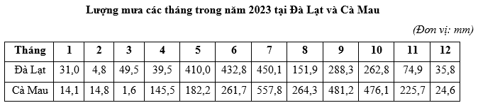 Căn cứ vào bảng số liệu trên, hãy cho biết lượng mưa tháng mưa cực đại của Cà Mau gấp bao nhiêu lần lượng mưa tháng mưa cực tiểu của Đà Lạt (làm tròn kết quả đến hàng đơn vị).