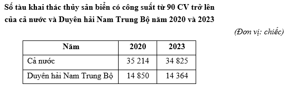 Căn cứ vào bảng số liệu trên, hãy cho biết tỉ trọng số tàu khai thác thủy sản biển có công suất từ 90 CV trở lên của Duyên hải Nam Trung Bộ trong tổng số tàu của cả nước năm 2023 so với năm 2020 giảm bao nhiêu phần trăm (làm tròn kết quả đến một chữ số thập phân).