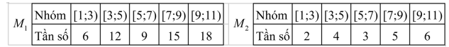 Hai mẫu số liệu ghép nhóm $M_{1},\,\, M_{2}$ có bảng tần số ghép nhóm như sau: