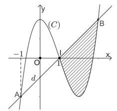 | d) Diện tích hình phẳng giới hạn bởi đường cong $(C)$ và đường thẳng $d$ (phần gạch chéo) bằng 8 |