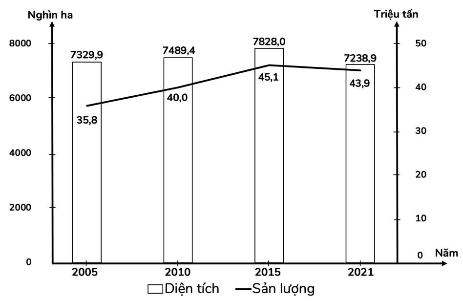 Cho biểu đồ sau: Diện tích và sản lượng lúa của nước ta giai đoạn 2005 - 2021 Nhận xét nào