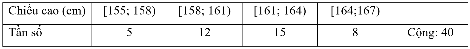 Hãy lập bảng tần số ghép nhóm với các nhóm [155; 158), [158; 161), [161; 164), [164;167).