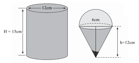 b) Hộp kem chứa kem sẽ được chia vào các bánh ốc quế hình nón có chiều cao $12{\mkern 1mu} {\rm{cm}}$ và đường kính $6{\mkern 1mu} {\rm{cm}}$, có hình bán cầu trên đỉnh như hình vẽ. Hãy tìm số que kem có thể chia được.