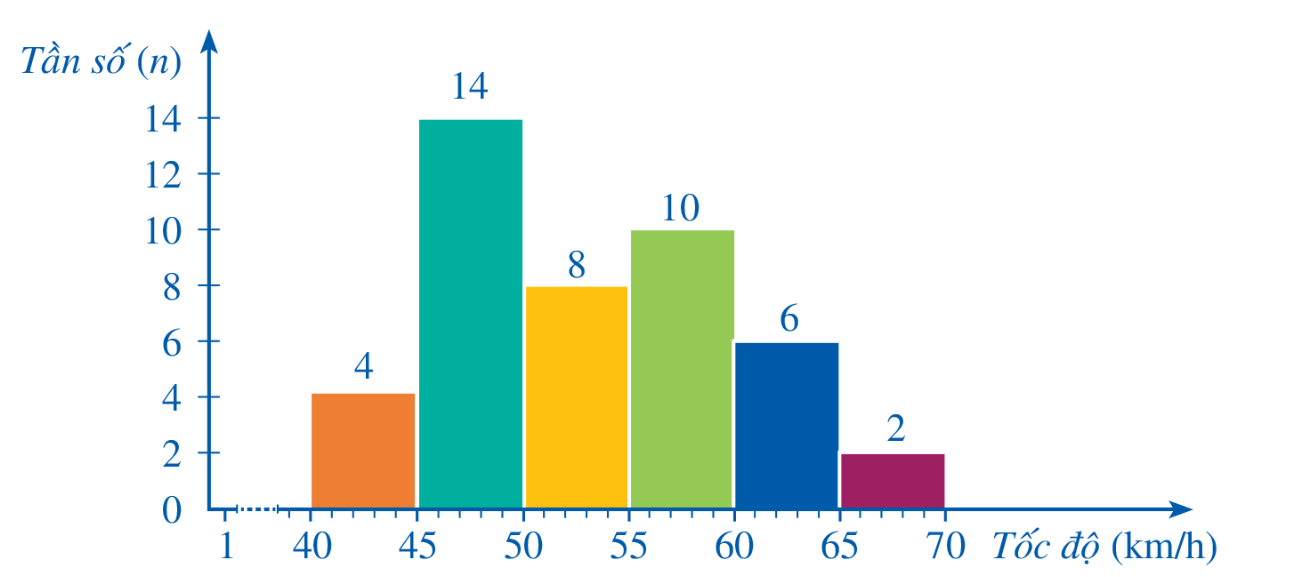 Sau khi thống kê tốc độ (đơn vị: km/h) của 44 ô tô khi qua trạm đo tốc độ, người ta ghép các số liệu này thành 6 nhóm tương ứng như biểu đồ cột như sau: