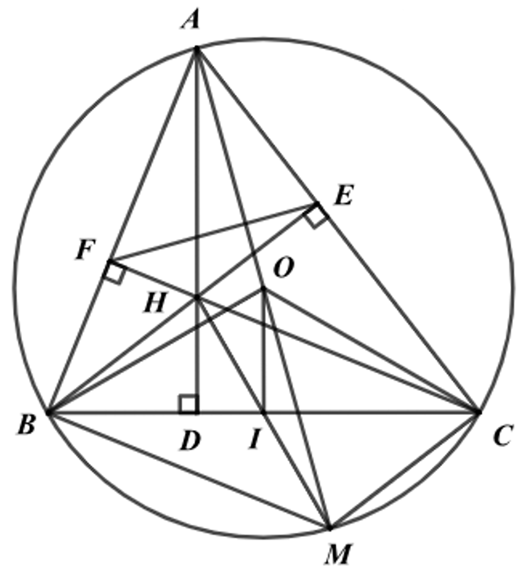 Cho tam giác ABC nhọn (với AB < AC) nội tiếp (O;R). Các đường cao AD, BE, CF của tam giác ABC cắt nhau tại H. Gọi I là trung điểm của BC.