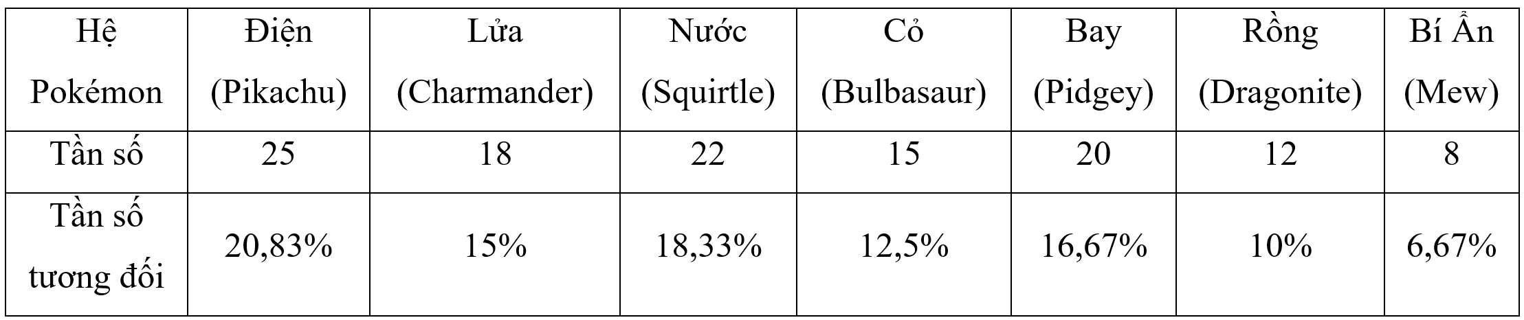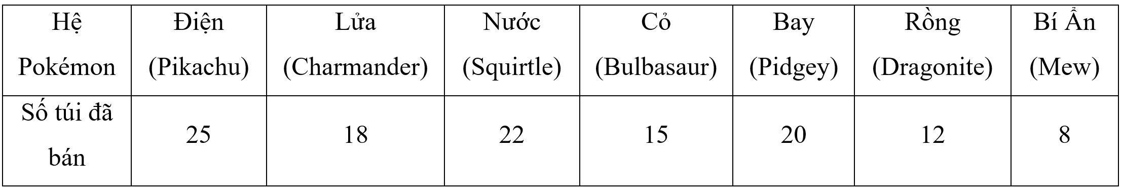Một cửa hàng bán túi mù Pokémon 2024 với các nhân vật ngẫu nhiên bên trong. Mỗi túi chứa một Pokémon thuộc các hệ khác nhau. Trong một ngày, cửa hàng ghi nhận số lượng túi đã bán theo bảng sau: