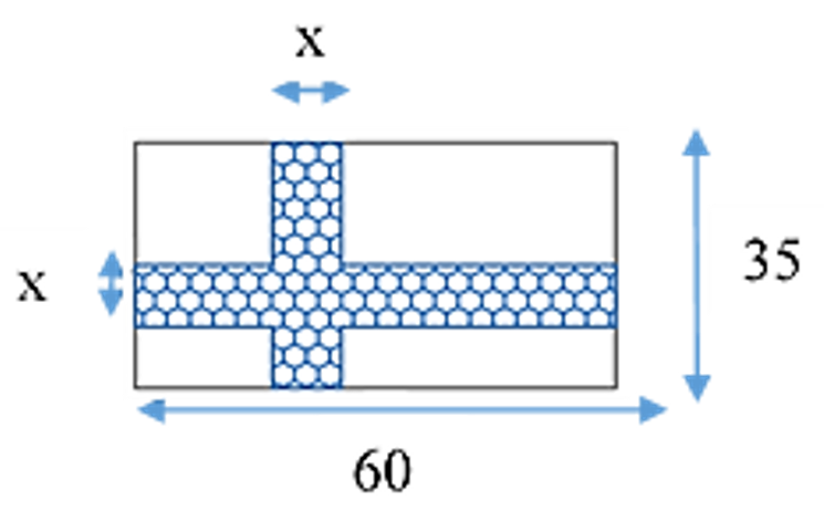 Một mảnh vườn hình chữ nhật có chiều dài 60 m, chiều rộng 35 m. Trên mảnh vườn hình chữ nhật đó, người ta làm một lối đi có chiều rộng $x$ (m) ($0 < x < 10$) như hình vẽ.