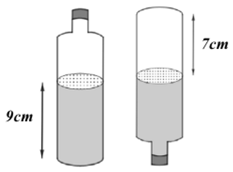 Có một chai đựng nước suối như trong hình vẽ. Bạn An đo đường kính của đáy chai bằng 6cm, đo chiều cao của phần nước trong chai được 9cm rồi lật ngược chai và đo chiều cao của phần hình trụ không chứa nước được 7cm (hình minh họa).