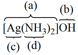 Cho phức chất với kí hiệu các thành phần trong phức chất như hình bên. Tên gọi của các thành phần (a), (b), (c) và (d) lần lượt là
