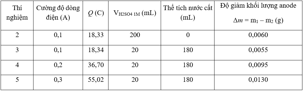 Để kiểm chứng hai giả thuyết này, nhóm học sinh tiếp tục tiến hành thí nghiệm theo các bước trên, sử dụng cảm biến để đo điện lượng Q (C) chạy qua mạch và tính độ giảm khối lượng anode. Các điều kiện khác là giống nhau. Kết quả thí nghiệm được thể hiện trong bảng dưới đây: