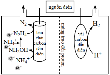 Nguyên lí hoạt động của tế bào điện phân sinh học sử dụng vi khuẩn oxi hóa NH4+ kị khí để xử lý nước thải có hàm lượng nitrogen cao, đồng thời sản xuất khí hydrogen cho năng lượng tái tạo được minh họa như hình vẽ.